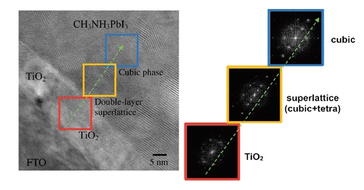 Figure 4 is a high-resolution TEM observation of a thin-film sample of CH3NH3PbI3, the well-known perovskite material used in PVCs. In contrast to our expectations, we observe a coexistence of tetragonal and cubic phases depending on the sample region observed. The observation of the cubic phase—a high-temperature phase that should not exist at room temperature—came as a major surprise; to explain it, we note that this PVC is an extremely thin film of thickness just 300–500 nm, and we surmise that, in the process of cooling from a heated state to room temperature during our fabrication procedure, some cubic-phase regions of the sample were quenched and remained in place thereafter, as shown in Figure 5.