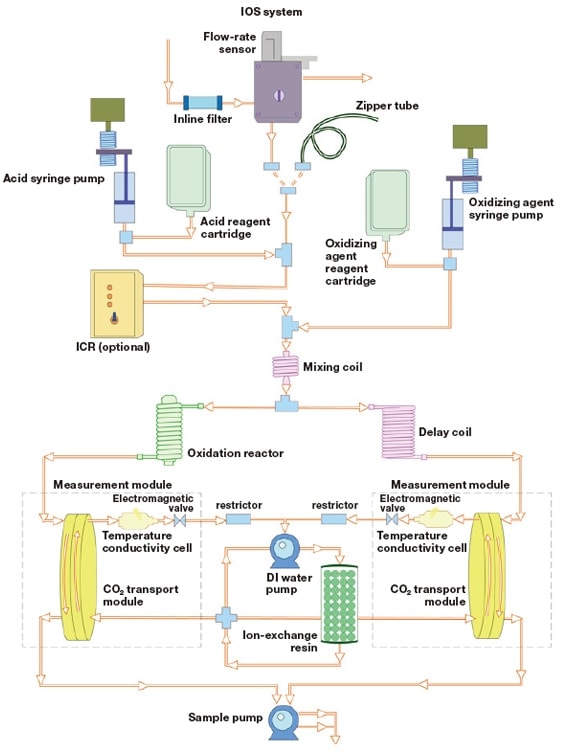 Wet-oxidation OCD systems consist of several components connected end-to-end in a single-line configuration: a solution-sending pump, a degassing apparatus to remove inorganic carbon from the sample and eluent, a syringe pump to inject oxidizing agents and buffer liquids, a UV lamp to promote the oxidation reaction, and an Membrane Conductometric cell to measure CO2 gas quantities. In Japan, the M9e series of instruments (descendants of the original 800 Series Total Organic Carbon Analyzer) are available for purchase from the distributor Central Kagaku Corp. The procedural flow of a typical analysis is depicted schematically in the figure below.
