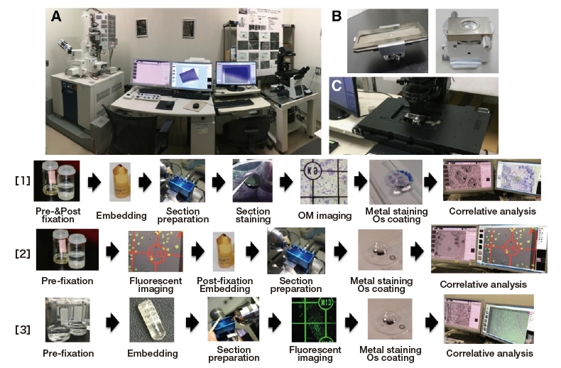 To know accurately the function of functional molecules such as proteins in vivo, it is necessary to clarify the intracellular localization of organelles and cells. For example, the intracellular localization and dynamics of specific proteins have been easily observed by fluorescence live-imaging using green fluorescent protein (GFP) in recent years. When intracellular ultrastructural information exceeding the resolution of optical microscopy is required, electron microscopy observations are necessary. However, the visible light region used for fluorescence imaging cannot be detected by an electron microscope. In this case, localization can sometimes be performed using immunoelectron microscopy with antibodies as fluorescent tags1). However, depending on the nature of the antibodies or antigens, immunoelectron microscopy may not be possible. Also, it is an advanced technique that requires an experience operator. In addition, it is difficult to conclude that a structure in which gold particles are localized is the same as the structure that emits fluorescence, and it is only possible to perform an estimation. To obtain definitive results, it is necessary to perform electron microscopy observations of the same samples from which fluorescence from GFP or other markers was observed. The technology that makes this possible is known as correlative light and electron microscopy (CLEM).