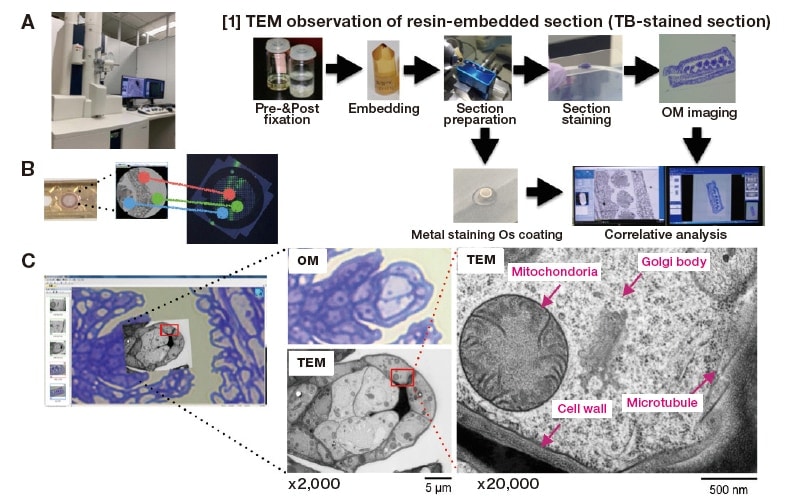 Semi-thin sections with a thickness of 500 nm-1 μm are prepared from a resin block for morphology observations using osmium-fixed samples, and affixed to glass slides. After TB staining, an upright microscope or similar instrument is used to acquire low- and high-magnification images of the target field of view (FOV). Thereafter, uranyl acetate solutions and lead citrate solutions are used to perform heavy metal staining, followed by osmium coating. Optical micrographs ranging from low to high magnifications are read by MirrorCLEM and used to create an opticalmicroscope map. Glass slides are mounted on the SEM sample jig and MirrorCLEM is used to achieve three-point alignment of the section with the optical-microscope map. This ensures that, when the optical-microscope map is moved, the stage moves to the same location, while enlarging the optical-microscope map enlarges the SEM image by the same magnification; image acquisition then automatically saves the SEM image on the optical-microscope map. For example, capturing FE-SEM images of a TB-stained section of a mung bean germinated cotyledon allows one to observe subcellular organelles—not visible via optical microscopy—while tracking the observation position via optical microscope (Figure 2-[1]).