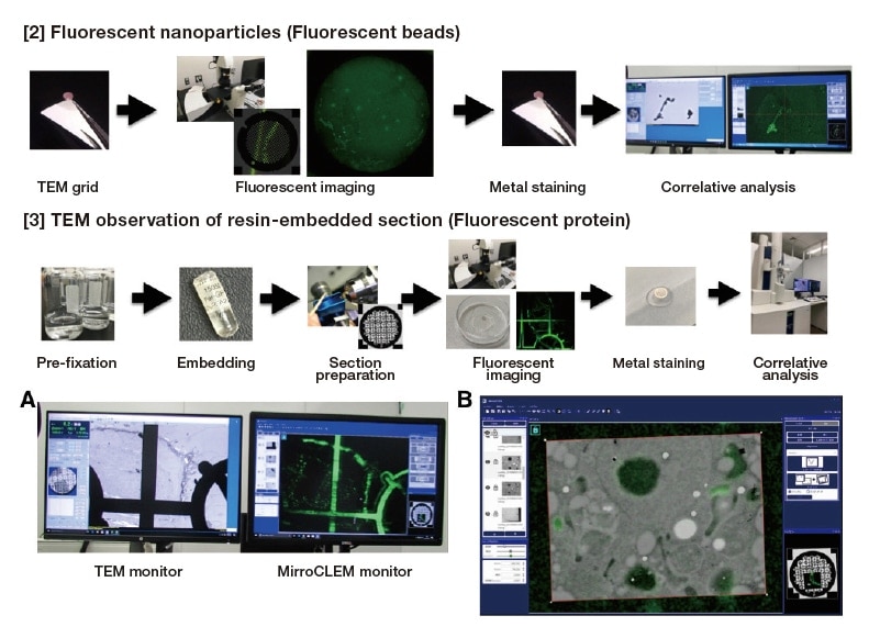 The MirrorCLEM system can control the latest TEM instruments, such as Hitachi’s HT7800 (Figure 3A), which enables the reading of images acquired by an optical microscope, after which 3-point alignment (Figure 3B) may be used to find regions of interest in optical micrographs within the TEM system, or the electron microscope can be used to identify the sample region observed by the optical microscope. The captured electron micrograph of the same region as in the optical micrograph can then be saved. This procedure not only yields correlation images, but also allows optical micrographs and electron micrographs to be linked together and saved, which is an extremely convenient feature. Here we will present three detailed case studies: [1] CLEM with semi-thin and ultra-thin sections, [2] CLEM with fluorescent nanoparticles on a TEM grid, and [3] CLEM with fluorescent protein images of ultra-thin sections mounted on a TEM grid.
