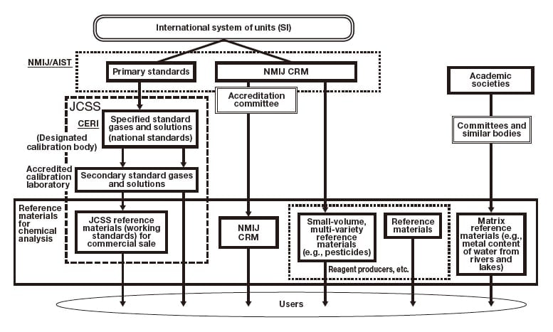 As noted above, in practice there are many substances known as “reference materials”—including both reference materials guaranteed by producers of reagents, and matrix reference materials supplied by academic societies used at experimental facilities or for assessing the skills of analytical personnel—and the metrological traceability of many of these is unclear. In contrast, metrological traceability is clearly established for the standard gases and standard solutions provided by the metrological traceability framework of the Japan Calibration Service System (JCSS)— discussed below—as well as for CRMs provided by the National Metrology Institute of Japan / Japan’s National Institute of Advanced Industrial Science and Technology (NMIJ/AIST). In practice, one must make choices appropriate for the task at hand, remaining cognizant that different reference materials offer different levels of reliability.