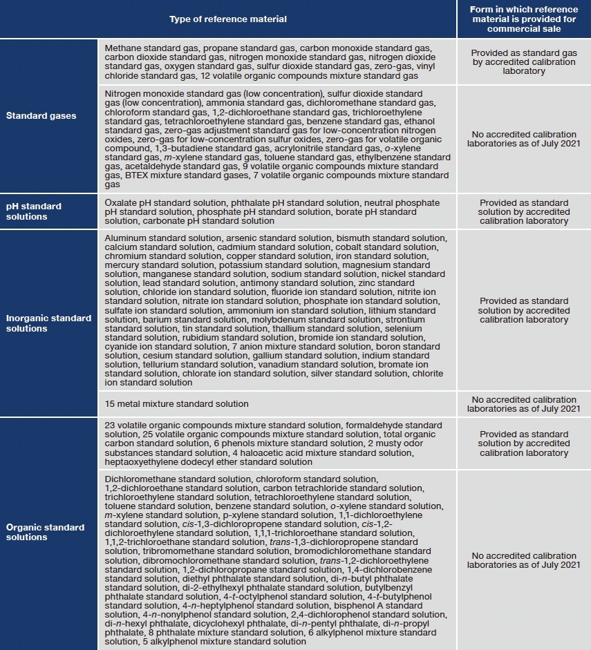 We will use the term JCSS reference materials to refer to reference materials provided by the Japan Calibration Service System (JCSS), a metrological traceability framework created in 1993 by legislation amending Japanese Measurement Act. The JCSS provides metrological standards for length, mass, time, and 22 other physical quantities, one of which is concentration (of reference materials). Supplies of JCSS reference materials are made possible by the following hierarchical framework. First, designated calibration body [Chemicals Evaluation and Research Institutes, Japan (CERI)] is designated by Japan’s Ministry of Economy, Trade, and Industry to preparation and maintain specified standard gases and solutions —corresponding to national standards—and to calibrate (and assign values to) secondary standard gases and solutions prepared by accredited calibration laboratories. The accredited calibration laboratories then use their secondary standard gases and solutions to calibrate (and assign values to) working standard gases and solutions for practical applications, which are accompanied by calibration certificates—stamped with the official JCSS logo for authentication—and made available for commercial sale. Because the concentrations of Specified standard gases and solutions are traceable to the international (SI) system of units through CRMs from the National Metrology Institute of Japan (NMIJ), the calibration hierarchy ensures that the concentrations of JCSS reference materials are traceable to SI units as well. Thus, JCSS reference materials have clearly traceable metrological pedigrees and serve as powerful tools for ensuring the trustworthiness of measured data. As of July 2021, a total of 135 varieties of designated specified standard gases and solutions —including 34 standard gases and 101 standard solutions—have been established.
