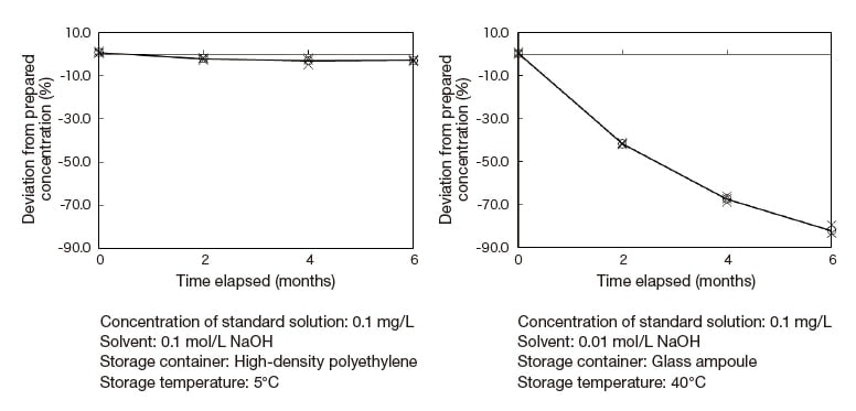 When a standard solution is retrieved from long-term storage and used to make measurements, no effort is made to check for, or correct, discrepancies between the actual concentration of the stored solution and the nominal concentration at which it was prepared or labeled (before storage). Thus, it is important to store solutions under conditions that prevent their concentration from varying over time; indeed, concentration measurements based on calibration curves created using incorrectly-concentrated standard solutions are clearly incapable of producing reliable results. This requires accurately assessing the stability of stored solution concentrations. For JCSS reference materials, storage stability tests are conducted at the development stage, and optimal storage conditions are determined through comparative assessments of storage containers, storage temperatures, solvent of dilution, and other relevant considerations.