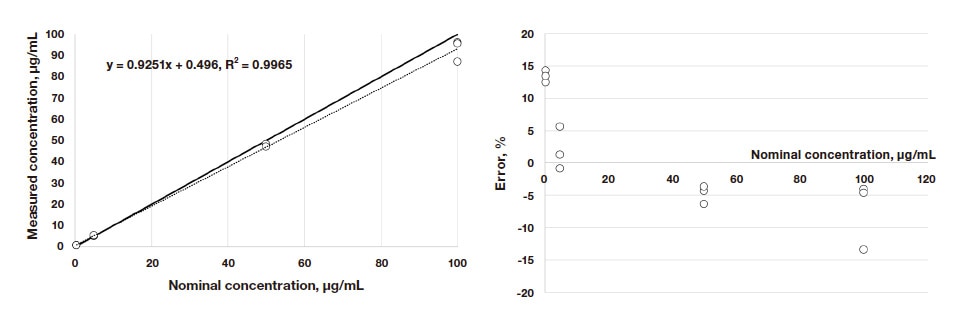 Right: Systematic error in Bland-Altman analysis. At the low concentration end, measured concentrations tended to deviate from nominal concentrations in the positive direction, but by no more than 15%. Accuracy is not an issue.