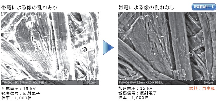 帯電しやすい試料は「帯電軽減モード」を用いることで、帯電を抑えて観察できます。