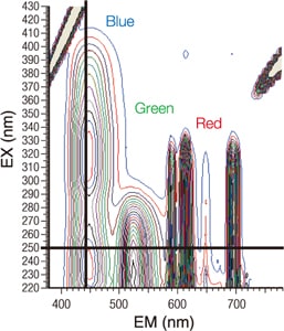 It presents spectra at specific wavelengths. By using the blue, green, red spectra data represented in 2-D, the technique can be applied to the measurement of fluorescent colors (fluorescence chromaticity coordinates).