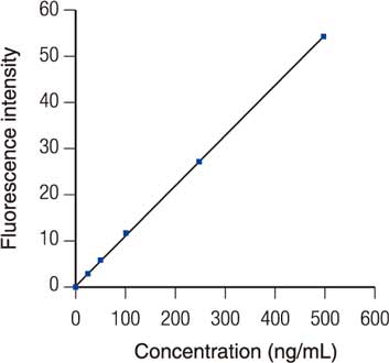 An example of the high sensitivity analysis for fluorescein is shown. The F-7100 detected fluorescence in the order of 1x10-13 mol/L (sub-picomol) compared with a blank sample (purified water); a useful calibration was obtained in the ultra-trace range.