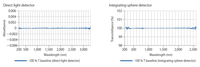 Generally, UV-visible/near-infrared spectrophotometers use different detectors in the UV-visible region and the near-infrared region. Because different detectors are used, a difference in photometric values may arise in switching between detectors. Through know-how developed from the fundamentals, signal processing technology, and other techniques, the UH5700 holds the level difference when switching detectors to a minimum.