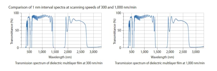 By employing a gear-drive system for the wavelength drive, high scanning speeds compared to conventional instruments are achieved of approximately 0.3 to 5,000 nm/min in the ultraviolet-visible region. *2 When measuring at a 1 nm interval, a measurement made at 1,000 nm/min in the 190 to 3,300 range can be completed in approximately 4 minutes.