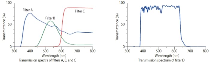 Filters allow light at specific wavelengths to pass through. Filters A, B, and C passed light in the blue, green, and red regions, respectively, and filter D passed light in the entire visible region.
