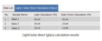 Calculations can be performed that conform to the test methods pertaining to the transmittance (reflectance) of plate glass (visible light transmittance, solar transmittance, solar reflectance) as specified in Japanese Industrial Standards JIS R3106-2019.