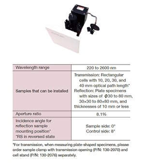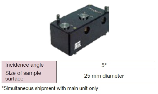 This accessory uses the mirror reflection of a sample to measure relative reflectance with respect to a standard reflection plate (aluminum-evaporated plane mirror). This is used for film thickness measurement, spectral reflectance measurement, and other such applications.