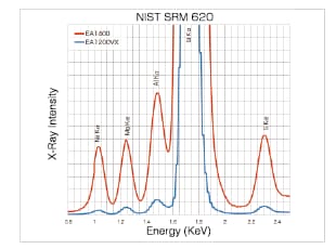 Compared to previous models (EA1200VX [see graph] or EA1000VX) EA1400 excels in detecting trace elements adjacent to the main components of the sample thanks to its high-resolution, high-count rate SDD which allows for exceptional performance in tasks such as quality control of metals and others.
