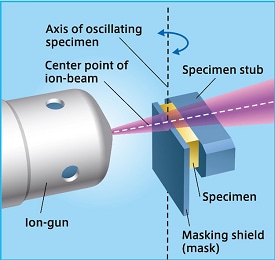 A pristine surface can be achieved by sputtering (milling) protruding parts of the specimen that extend beyond the maskedge. By irradiating the ion-beam parallel to the processed surface of the specimen, flat and smooth milling is possible even with complex materials of different compositions.