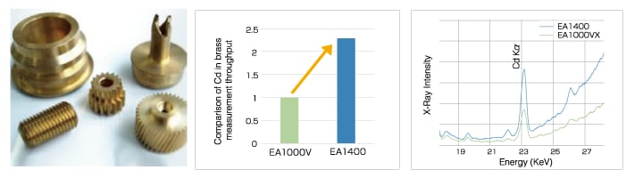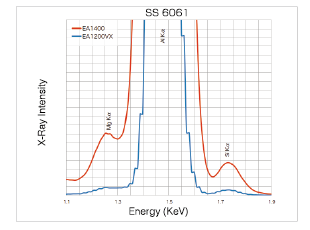 Compared to previous models (EA1200VX [see graph] or EA1000VX) EA1400 excels in detecting trace elements adjacent to the main components of the sample thanks to its high-resolution, high-count rate SDD which allows for exceptional performance in tasks such as quality control of metals and others.