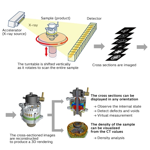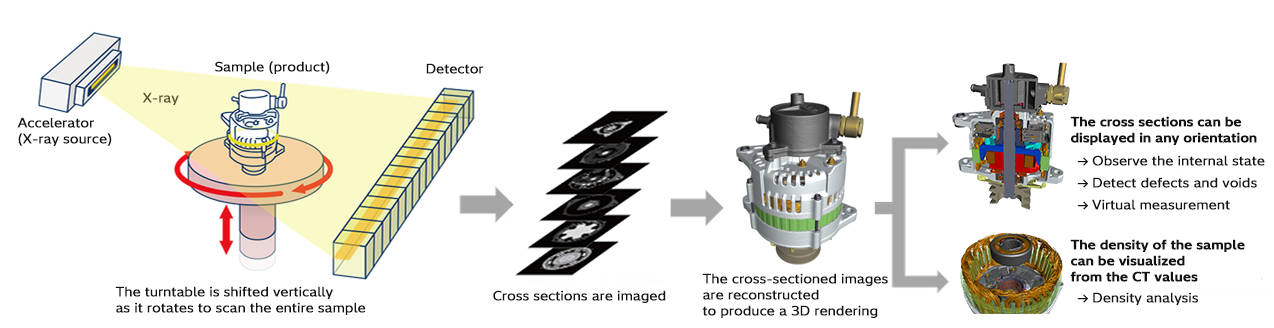 The above diagrams show examples of images of different material samples with a length of 300 mm at different X-ray energy levels. For X-ray energy of 9 MV, a SUS steel sample can be sufficiently penetrated without producing artifacts. However, at 1 MV, the penetrability is insufficient for SUS steel and TiN samples, resulting in streak artifacts.