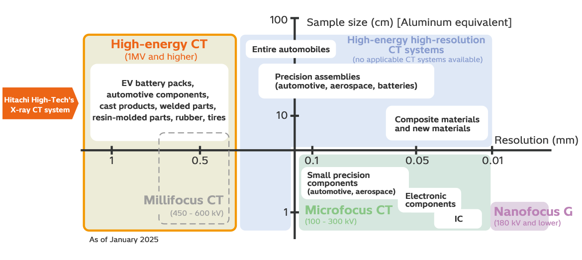 This graph shows the differences in penetrability achieved at 450kV, 1MV and 9MV output levels for various materials. Penetrability is determined by the material through which the X-rays pass, the energy of the X-rays, and the dynamic range of the detector. The higher the density of the X-rayed material (higher densities are shown at higher points on the graph), the more difficult it is for X-rays to pass through. When a sample whose length is higher than this penetrability is imaged, streak artifacts are produced.