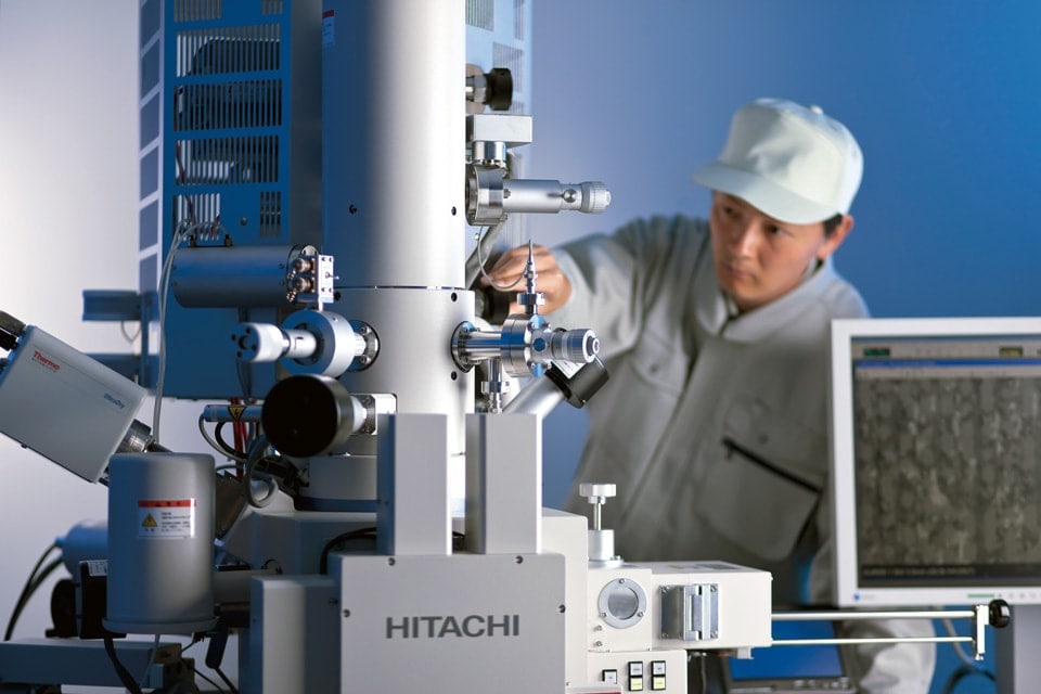 金属・セラミック・高分子・生物組織などの研究所、半導体メーカー、大学・高専の研究室、医療機関など、幅広い分野で使用されており、先端科学の場で欠かせない装置の一つと言えます。電子顕微鏡を取り扱う解析装置部(※2023年度、電子顕微鏡部から変更)のサービスエンジニアは、さまざまな分野で研究開発やモノづくりに取り組まれるお客様個々のニーズやご要望に沿って、多種多様なソリューションサービスのご提案を行っています。