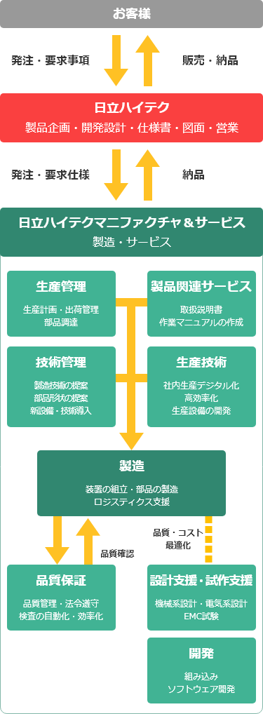 日立ハイテク製品である各装置や部品の製造・組立のほか、ソフトウェア開発や機械系設計などの設計・試作支援サービスもおこない、高品質・高効率生産に貢献。さらにIoTなどを活用して工場内の機器や設備、作業データを見える化し、情報の共有化・一元化を可能にするなど、工場全体の最適化「スマートファクトリー」を目指しています。