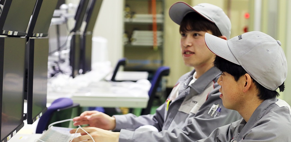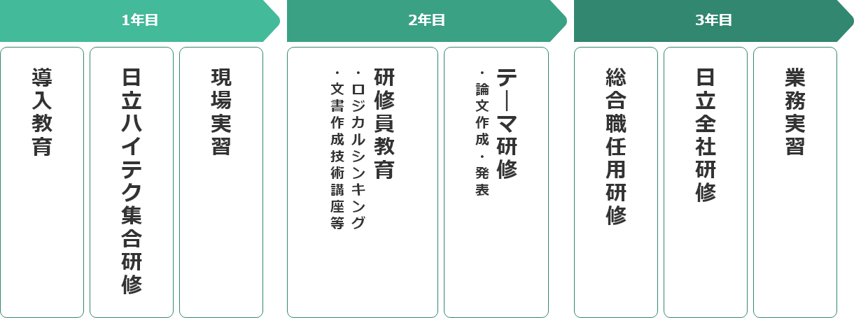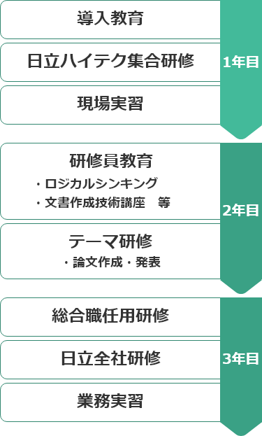 基礎教育や日立ハイテクとの合同研修、製造現場での実習の後は配属先でのOJTによる入念な指導でサポート。2年間は育成期間(研修員)としてじっくり成長していただきます。
