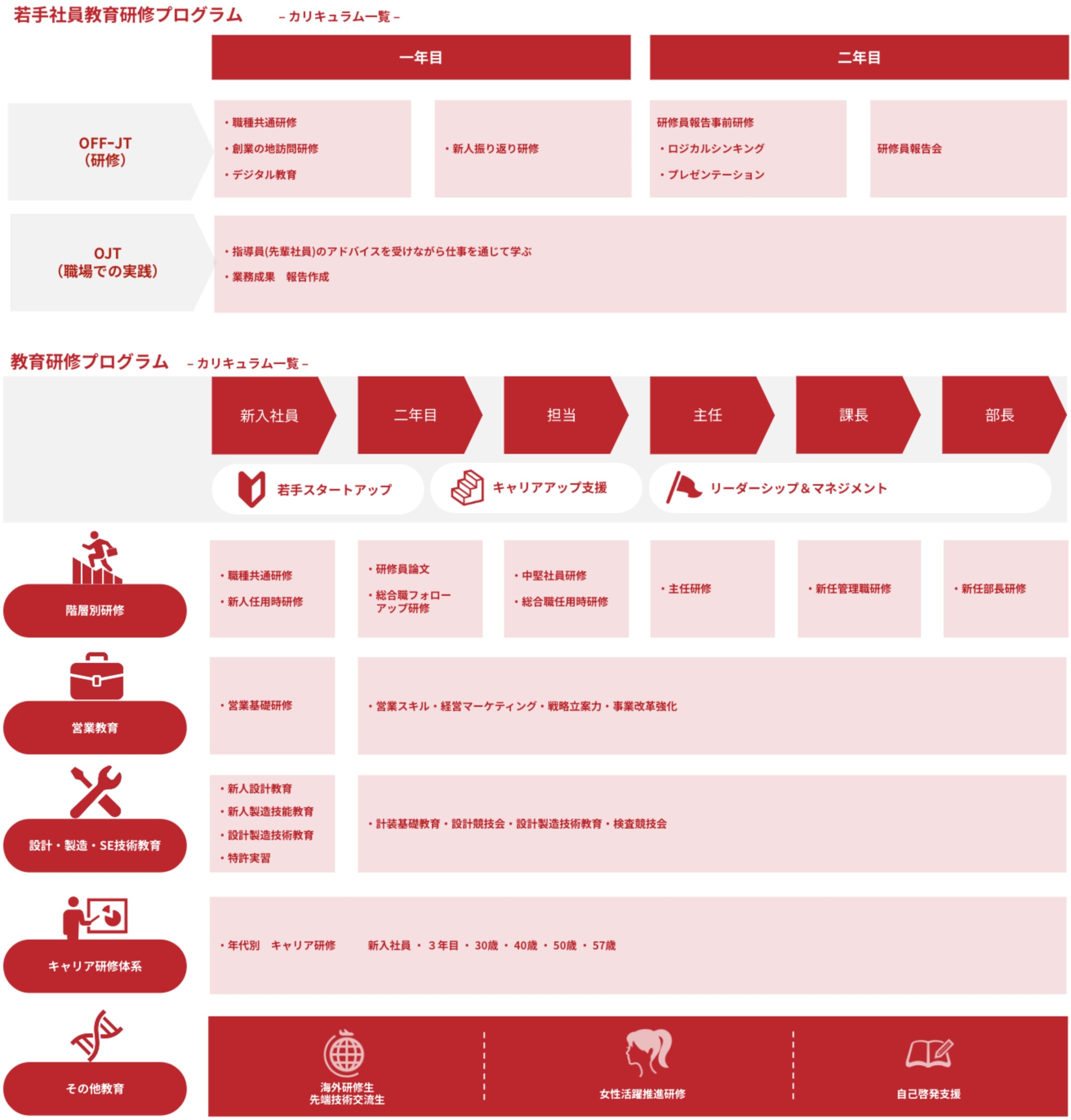 上図の各種研修プログラムに加え、OJT制度による新入社員教育を行っています。指導者である先輩社員のもと、実際の業務を行いながら仕事のノウハウを学びます。