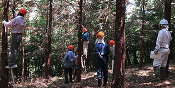 その一環として、日立ハイテクは、林野庁の「法人の森林」制度を利用し、茨城県石岡市に約2.3haの国有林を借り受け、「日立ハイテクやさとの森」と命名し、2005年から60年間にわたる育林活動に取り組んでいます。森を育てるために行う下草刈りや枝打ちなどの作業には、新入社員や社員有志とその家族が参加しています。今後も、苗木が成長し伐採されるまで継続的に森を育て、地球環境の保護・地球温暖化の防止に寄与していきます。