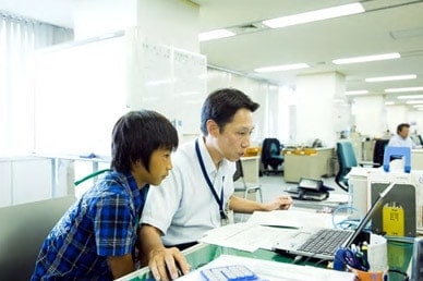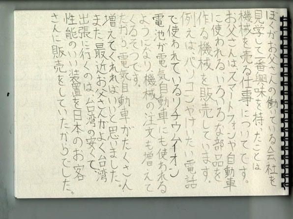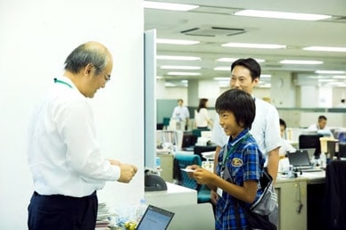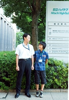 TOP 事業セグメント ヘルスケア・ソリューション ナノテクノロジー・ソリューション バリューチェーン・ソリューション コアテクノロジー・ソリューション プロジェクトストーリー #1 業界最先端を切り拓く開発 #2 新ラインナップとなる製品開発 #3 日本と世界をつなぐ海外活躍 #4 可能性を広げる革新的な開発 #5 世界No.1シェアのモノづくり #6 次世代につながる新技術開発 仕事と人 エンジニア 営業 事業スタッフ 人財育成・福利厚生 人財育成 福利厚生 ワークライフバランス ダイバーシティ 社会貢献活動 採用情報 求める人財像 新卒選考プロセス キャリア採用特設サイト 募集要項 グループ採用情報 >マイナビ25 >マイナビ26 >アルムナイ 新卒ENTRY キャリアENTRY ENGLISH 営業職の会社見学には、産業インフラソリューション部、石川家から11歳の凌羽くんが参加しました。世界に向けて、様々な装置を販売する商社営業。お父さん、凌羽くんにきちんと仕事の説明をするのは、今回が初めてとのこと。理解するには、ちょっとむずかしい部分もあると思いますが、お父さんの想いは伝わったのでしょうか。 お父さん:石川(生産システム営業本部) こども:凌羽(りょうは)くん 今日の仕事は、午後からのスタート。まずは、受付でしっかり挨拶をします。 働いているお父さんの姿を見るのは、はじめてです。 まずは名刺交換の練習から。さすが営業の血を引く凌羽くん。筋がいいですね。 社員さんとの実際の名刺交換を、遠くから心配そうにみつめるお父さん。大丈夫、上手にできていますよ。 さっそく、お父さんの仕事を説明。新聞のニュースをつかって紹介します。うまく伝わるかな。 例えば、携帯電話の中に入っているこの部品を…実際の例を見ながら、少しずつ学んでいきます。 勉強したことは、ちゃんとノートにメモをとって忘れないようにしないとね。 いよいよ、お父さんの職場に突入。みんな歓迎ムードで出迎えてくれました。 本部長にも、しっかり挨拶。偉い人が出てきて、ちょっと緊張気味かな。 チームのメンバーにも、ご挨拶。「お父さんが、お世話になっています。」ちょっと余裕が出てきたかな。 さっそく、仕事をはじめます。まずはじめは、資料のスキャンから。 先輩に教えてもらって、おそるおそるボタンをおします。 どうにかうまくできたようです。初仕事、成功! 今度は、お父さんにかわって電話をかけます。間違えないように慎重にね。 まだまだ仕事が舞い込んできます。次は、書類の承認。ちょっと偉くなった気分? 日付を確認して…はんこひとつ押すにも、全力投球! よく働いたので、ちょっと休憩の時間。先輩も、一緒にどうですか? 日立ハイテク本社の地下には、カフェテリアがあります。何を飲もうかな? 先輩が、大好きな釣りの話をしてくれました。仕事の事を忘れて、のめり込んでしまい……あ、もうこんな時間! 職場に戻ると、今度は先輩社員のみなさんに、取材です。 「今、どんな仕事をしているんですか?」「その仕事は、何が楽しいのですか?」むむっ、なかなかするどい質問ですね。 しっかりメモを取って、忘れないようにします。 最後は、営業の打ち合わせに参加です。議題は、「販売価格について」 「それは、ダメだと思う!」一生懸命、自分なりの意見もでてきます。 ようやく1日が終わりました。たくさん働いたね。おつかれさまでした。 仕事が全部おわって、絵日記を書く時間。「絵が苦手だから、作文でもいいかなあ?」いいですよ。想いのたけをつづってください。 最後に、お父さんと肩を組んで記念撮影。 おつかれさまでした。今夜は、おいしいごはんが食べられそうだね。これからは、お父さんと仕事の話もできるといいね。 凌羽くんの日記 その1 凌羽くんの日記 その2 TOP 事業セグメント プロジェクトストーリー 仕事と人 人財育成・福利厚生 採用情報 ENGLISH アルムナイ マイナビ25 マイナビ26 新卒ENTRY キャリアENTRY