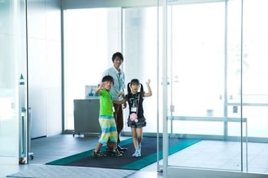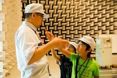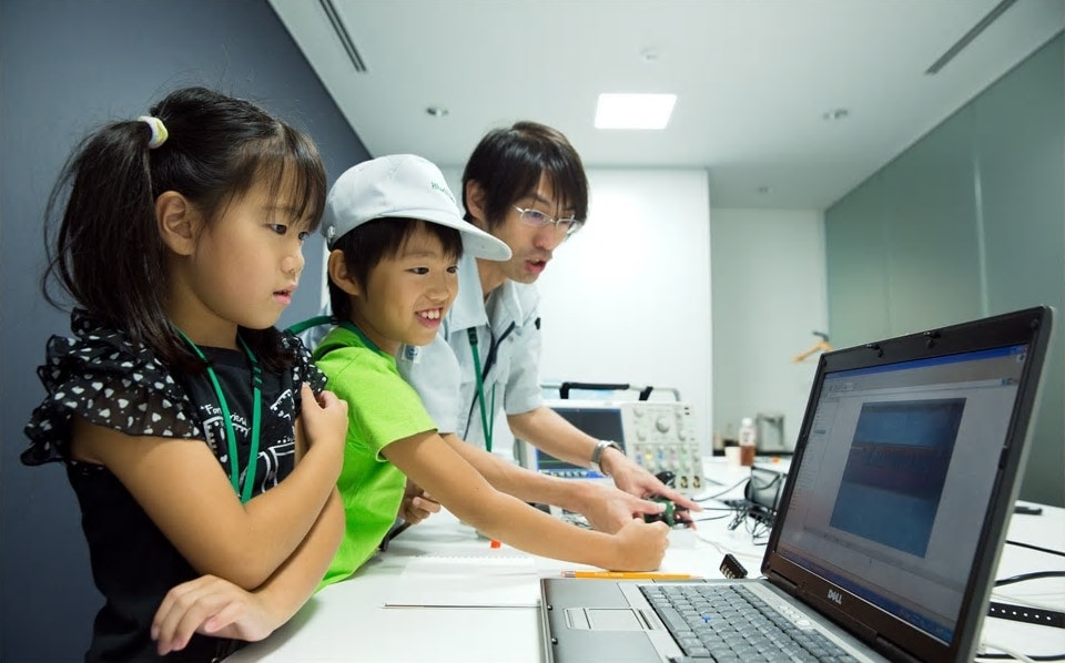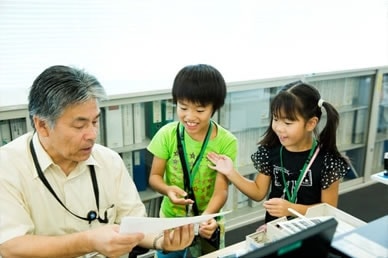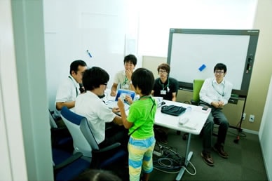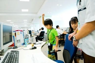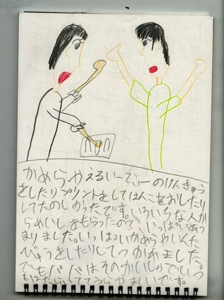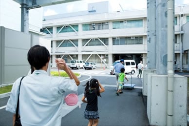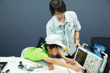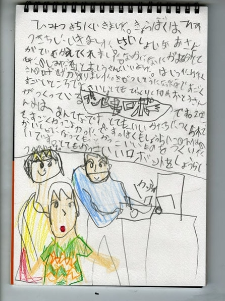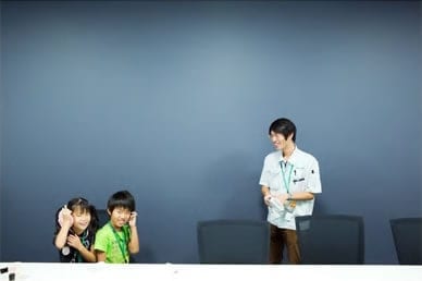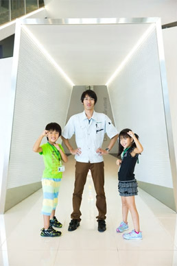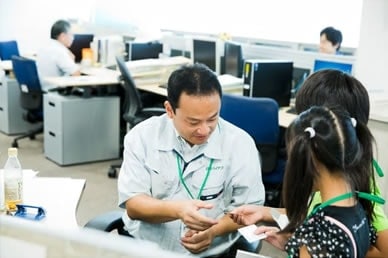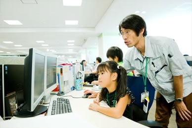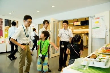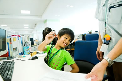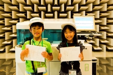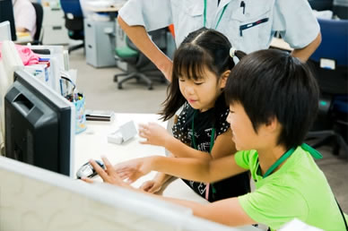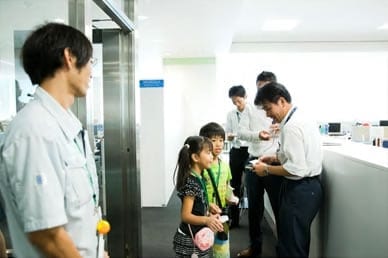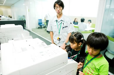 TOP 事業セグメント ヘルスケア・ソリューション ナノテクノロジー・ソリューション バリューチェーン・ソリューション コアテクノロジー・ソリューション プロジェクトストーリー #1 業界最先端を切り拓く開発 #2 新ラインナップとなる製品開発 #3 日本と世界をつなぐ海外活躍 #4 可能性を広げる革新的な開発 #5 世界No.1シェアのモノづくり #6 次世代につながる新技術開発 仕事と人 エンジニア 営業 事業スタッフ 人財育成・福利厚生 人財育成 福利厚生 ワークライフバランス ダイバーシティ 社会貢献活動 採用情報 求める人財像 新卒選考プロセス キャリア採用特設サイト 募集要項 グループ採用情報 >マイナビ25 >マイナビ26 >アルムナイ 新卒ENTRY キャリアENTRY ENGLISH 今日、会社見学に来るのは医用システム第二設計部で設計を担当する鈴木洋一郎さんの8歳の息子・娘、優統くんと愛優花ちゃん。なんと2人は双子。どこへいくにもいつも一緒。一緒だとパワーも2倍どころか3、4倍のパワフルな2人です。お父さんの仕事は、まだ2人にはちょっとむずかしいかもしれないけれど、持ち前の明るさと行動力でどんな事に興味を持ってくれるのでしょうか。 お父さん:鈴木(医用システム第二設計部) こども:優統(ゆうと)くん、愛優花(まゆか)ちゃん 出社とともに、まず2人のパワーに圧倒されます。元気という言葉だけでは説明がつかないくらい、テンションマックスです。 さっそく、名刺交換の練習。はじめて手にした名刺。自分だけのしるし。名刺交換の練習中にも、うれしくて、名刺と一緒に記念撮影。 手にした名刺をお父さんの職場の皆さんに配りに駆け出します。「あんまり走ると危ないよ」と声をかけるお父さんの呼びかけもどこ吹く風。 部署につくと、すれ違う人、目についた人、全員に声をかけて名刺交換開始!ちびっこたちのパワーに、大人たちもちょっぴり押され気味です。そして、心配半分、嬉しさ半分に見つめるお父さん。 「名前読めますか? ゆうとです。まゆかです。」積極的に自己アピールです。 部長にもちゃんとご挨拶。今日一日、お世話になります! 短時間でこんなに集まりました! 挨拶がおわったら、さっそくデスクで仕事。設計の仕事はまだちょっと難しいから、お父さんの日々の仕事をお手伝いです。 だんだんと、まなざしが真剣になっていきます。わからないところもいっぱいあるけれど、なんとか、理解しようとがんばっています。 はんこ押しのお手伝い。大きく振りかぶって! だいぶサマになってきたかな? 承認者に書類を渡して、無事ミッション完了です! 「これなに??」やっぱり机の中身は気になるようです。 「じゃあ、次はコピーをとりにいくよ。」見たこともない機械を目の前に興味津々です。 デスクへの道すがら、会議室にも突入して名刺交換。この積極性、将来が楽しみですね。 ひと仕事終えて、次は実験室(秘密基地)へ。お父さんから、今日は秘密基地に連れて行ってくれると聞いています。さて、どんなところだろう!? 工場内をてくてく。今度は、台車に興味を持ったようです。ちゃんと前見て歩くんだよ? いよいよ秘密基地到着!なんだ、このトゲトゲは!? さっそくノートを広げてお絵かき開始です。 「ここは何をするところなんですか!?」マイクの代わりに鉛筆片手に取材開始です。それにしても、鉛筆近すぎない?この部屋は、電磁波や電波によって、製品が影響を受けないか実験する施設。アンテナからは電磁波や電波が出ているんだよ。 大きくてかっこいいアンテナだなあ。愛優花ちゃん、思わず、ノートにスケッチ。ちゃんと勉強をしています。 お兄ちゃんのノートを見てみると……?どうやらお兄ちゃんは、機械よりも働く人に興味があるみたいです。 お父さん、すごいところで働いているんだなあ。そんな思いが顔からにじみ出ていましたよ。 会議室に戻って、今度はお父さんの仕事研究です。お父さんの設計した、発光ダイオードを光らせる回路の実物を見ながらお勉強です。 すごい、本当に光ってる!僕もやってみたい!モノづくりへの興味がすこし湧いてきたかな? 忘れないように、しっかりホワイトボードにメモをしておかないとね。 いつの間にか、真剣な表情で、機械の仕組みにのめり込んでいく優統くんと、愛優花ちゃん。 今度は血液自動分析装置に使われるカメラの実験です。 あれ、ホワイトボードのメモに、関係ないものまで? 研究はここまでです。では、最後に短い時間でしたが、今日楽しかったこと、興味を持ったことを絵日記にまとめましょう。 うーん、なかなか絵心がありますね。 午前中は、よく働いたから、おなかすいたね。お昼ごはんの時間ですよ。「僕、あれ食べたい!」 お父さんの同僚のみなさんと、一緒にお昼ごはんです。 ラーメンおいしいね。給食とどっちが好きかな? なんと、食事中にも名刺交換がはじまりました。まだ元気がありあまっているのかな。 ご飯も食べ終わって、会社見学終了。お父さんと記念撮影をパチリ。 今日