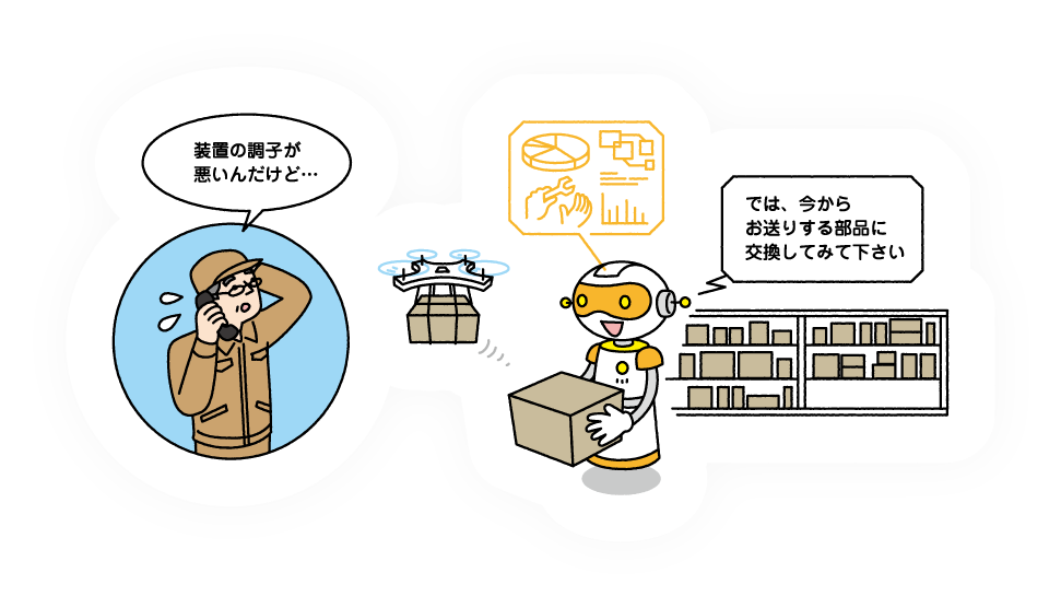 AIがお客様の話を聞いて緊急性が高いと判断したらドローンで部品を供給したり、長期的なサポートや部品の交換提案まで対応したりなど、お客様のビジネス円滑化に向けたサポートができる未来を想像しています。