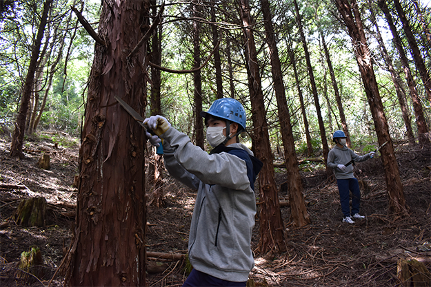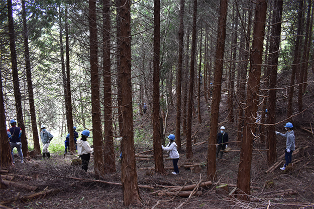 今回の活動では、林野庁茨城森林管理署・高萩森林組合の協力のもと、森林保護活動の意義・目的についての説明を受けた後、樹木の枝を切り落とす「枝打ち」を実施しました。枝を間引きすることで林内に光が入り、下層植生が充実して森林土壌の流出が防止できるため、森林保護につながります。