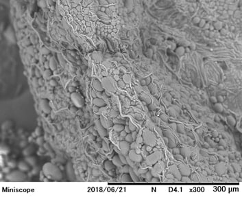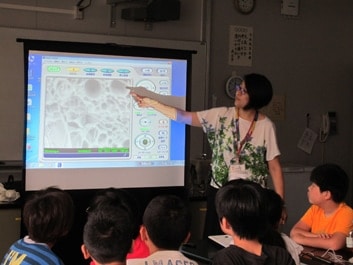 次の時間では、19人の児童たちが理科の学習単元「植物の成長と水のかかわり」に合わせ、学校花壇で育てているジャガイモとホウセンカを光学顕微鏡と日立卓上顕微鏡(Miniscope® TM3030)を使って試料の作成から操作・観察までを実体験し、両者の見え方の違いを学びました。
