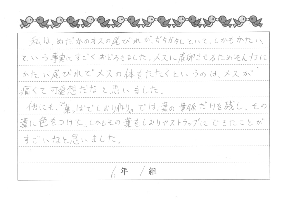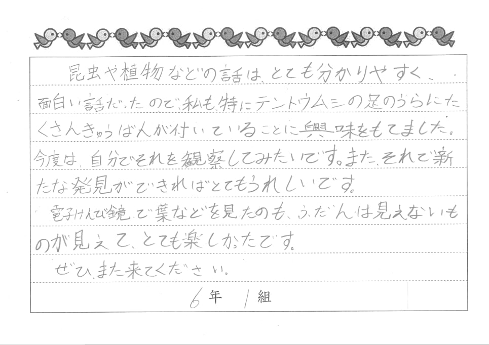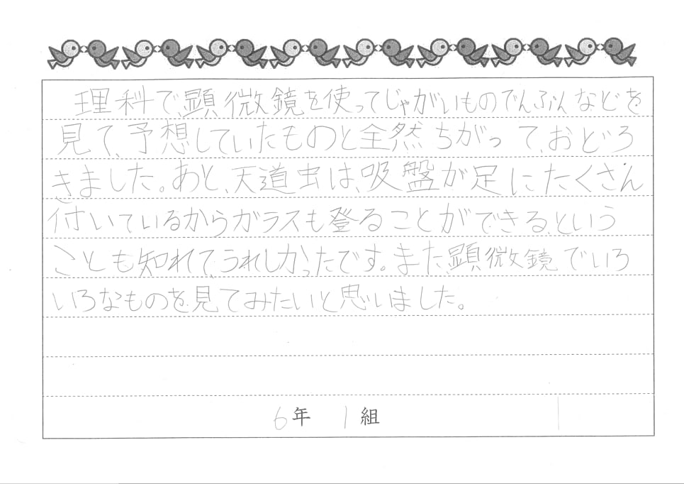 今回、永田さんのお話をお聞きしたり、電子顕微鏡を用いて植物を観察したりする中で、子どもたちはミクロの世界への関心を高めていました。普段見えないものを見ることができたり、その存在に気付いたりすることができ、授業中は感動の連続でした。また、「葉脈を使ったしおり作り」では、自然が持つ美しさを生かして、楽しく取り組んでいました。今回の学習を生かし、さらに理科への興味を高めていってほしいと思います。
