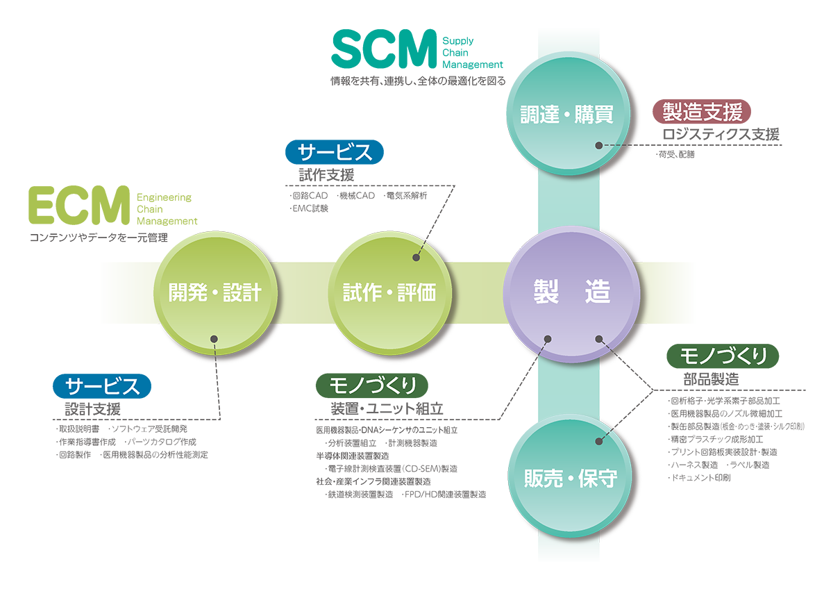 SCM(Supply Chain Management)の分野では調達・購買した部品の着荷・検収から在庫管理、部品の配膳・払出しまでの一連のロジスティクス支援から、装置・ユニットの組立や精密部品の製造、そして製品販売後の保守サービス部品の製造まで行っています。