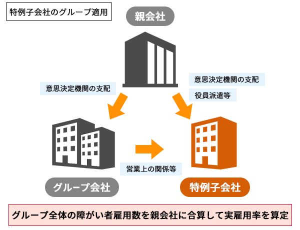 障がい者雇用の推進のために法律で定められた会社です。親会社と資本・業務の上で緊密な関係を持つこと、障がい者の方に特別の配慮があることなど、一定の要件を満たすことで、別法人であっても子会社が親会社と障がい者雇用者数を合算する事のできる制度です。