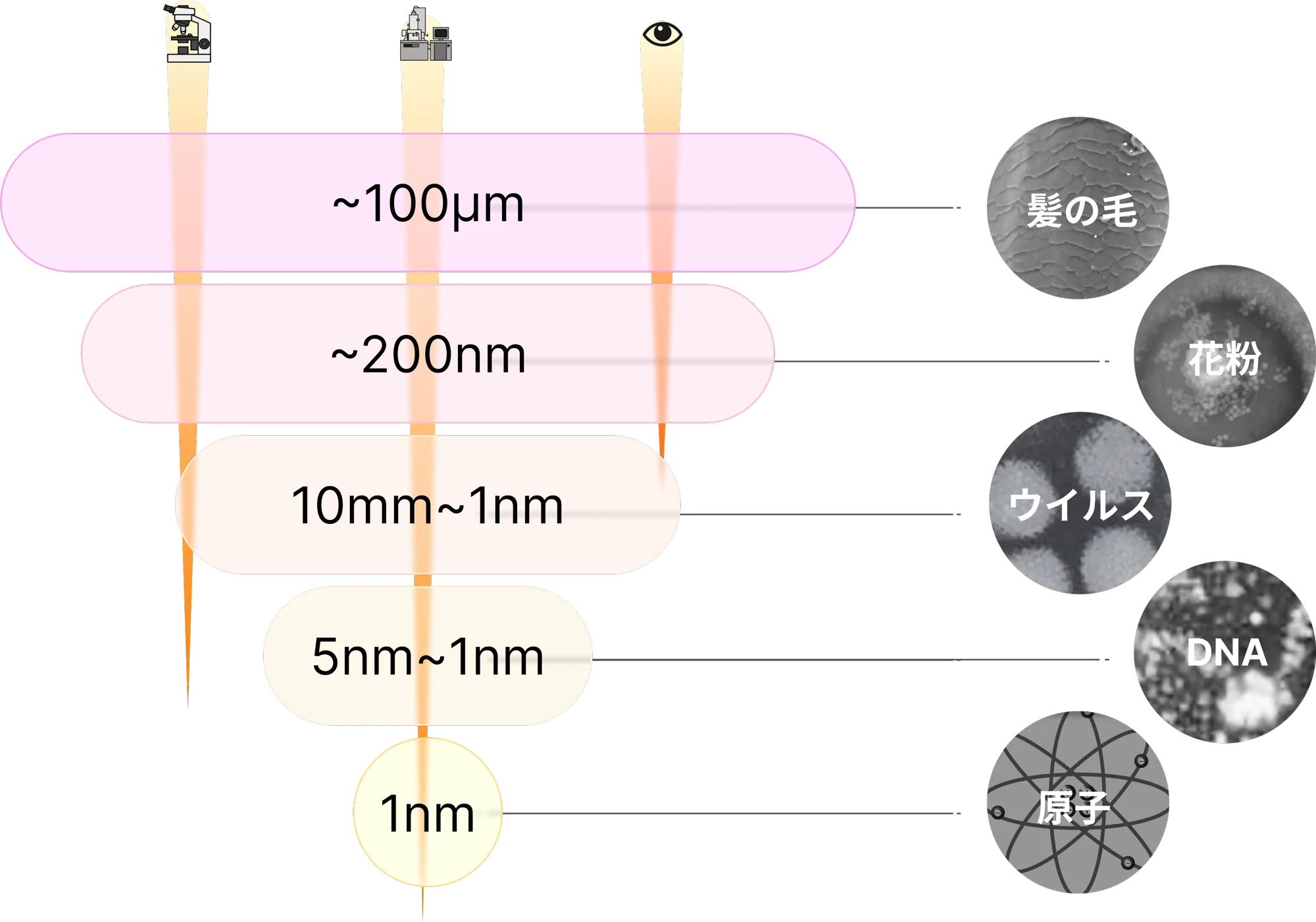 電子顕微鏡にはSEM(走査型)とTEM(透過型)があり、それぞれ異なる用途があるんだ。