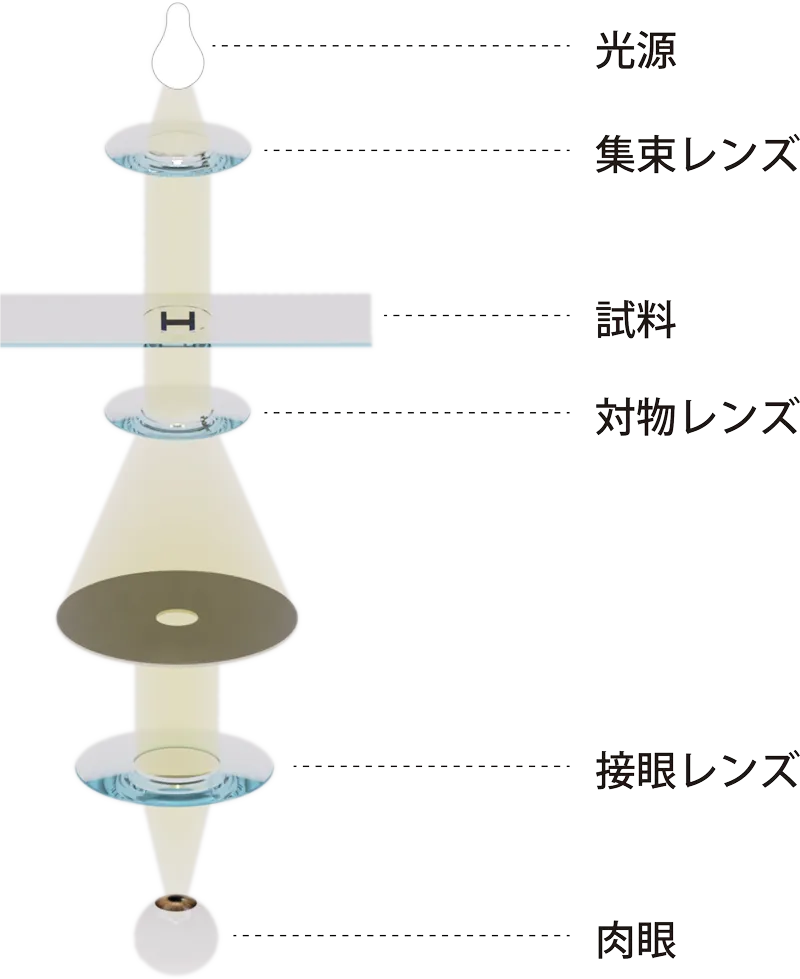 一般的にイメージされることの多い顕微鏡です。可視光線(人の目が光として感じることのできる電磁波の波長)