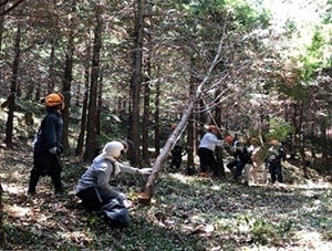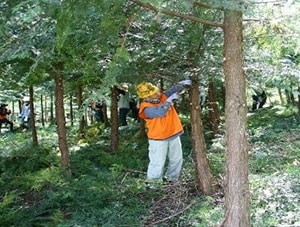 写真:節がなく丈夫な木を育てるために必要な枝打ち作業(2012年~2025年(予定))