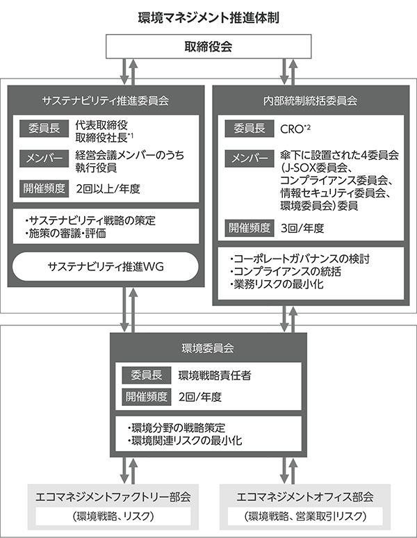 *2 CRO:CROは全社にまたがるリスク統括者であり、「内部統制統括委員会」の委員長として、環境リスクを含む業務リスクの最小化と緊急対策体制整備の責を負っています。