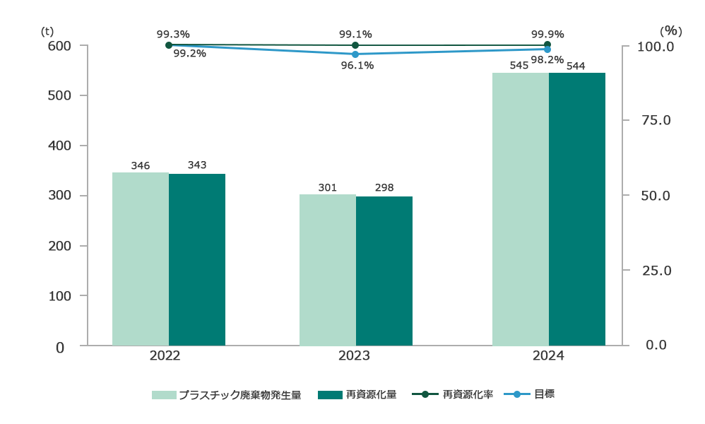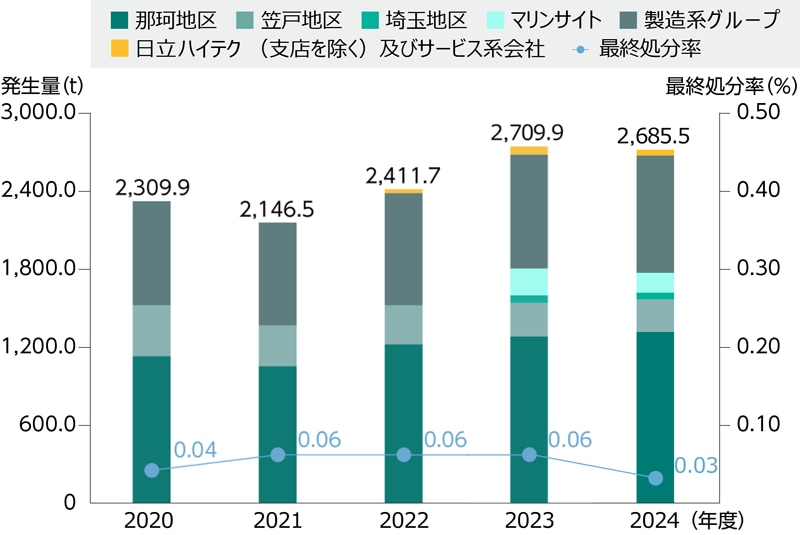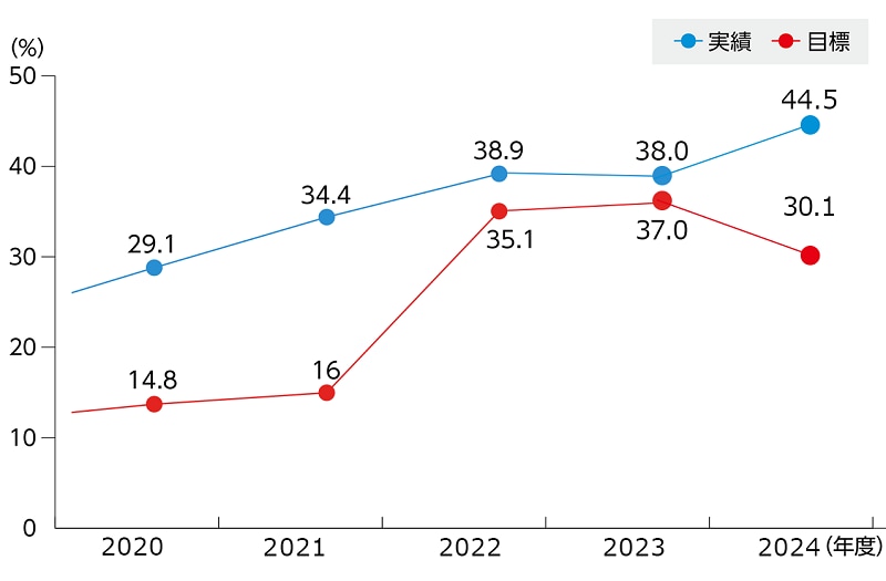 2024年度は「廃棄物発生量原単位改善、30.1%(基準年度2010年)」を目標とし活動を進めた結果、44.5%の改善となり目標を達成しました。