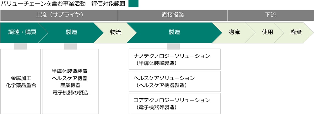 本レポートでは、バリューチェーン全体(直接操業、上流)を評価と開示の対象としています。直接操業では日立ハイテクの連結対象グループ会社すべて、上流では主要なサプライヤーを対象としています。開示のスコープとしては「ナノテクノロジーソリューション」「ヘルスケアソリューション」「コアテクノロジーソリューション」「バリューチェーンソリューション」の4つ事業ドメインの中から、スコーピングプロセスに基づき、主力製品の製造を行う「ナノテクノロジーソリューション」「ヘルスケアソリューション」「コアテクノロジーソリューション」の3つの事業ドメインに焦点を当てて評価を行うこととしました。