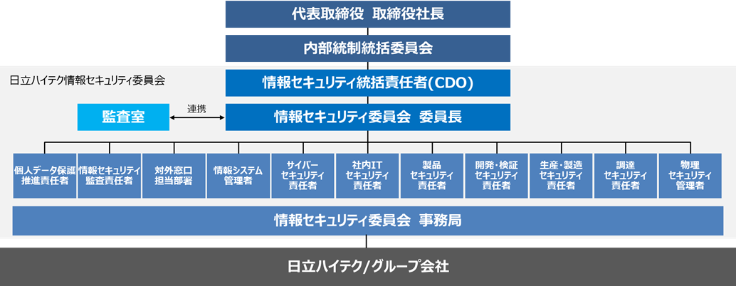 デジタル化の進展により、新たな価値が生み出される一方で、日々巧妙化するサイバー攻撃による情報漏えいや操業停止など、事業そのものの継続に支障をきたすリスクが大きくなっています。このリスクを最小化するため、情報セキュリティに関わるリスクマネジメントは、企業の最重要の課題の一つとなっています。こうした背景のもと、日立ハイテクは、価値創造とリスクマネジメントの両面からサイバーセキュリティ対策に努めることを重要な経営課題の一つと位置づけ、情報セキュリティに取り組んでいます。対応においては、日立グループ共通のセキュリティ基準に従って対策を実行しています。