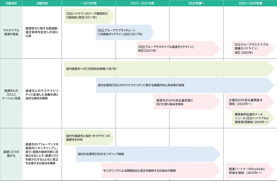 調達取引を新規に開始する場合には、(株)日立製作所が発行している「日立グループ サステナブル調達ガイドライン」に基づいて、社会的責任(倫理行動・人権配慮・労働慣行・環境問題・品質・安全等)に関わる取り組み状況を把握し、当社グループの調達・選定方針に則しているかを確認しています。