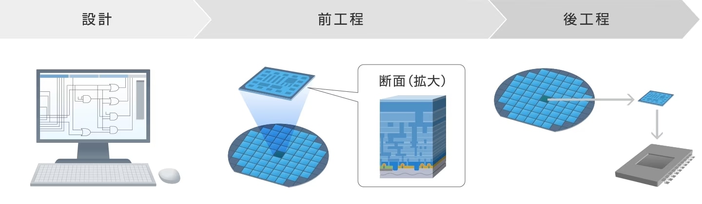半導体の製造工程は、大きく3つに分けられます。回路の「設計」、設計した回路をシリコンウェハの表面に作る「前工程」、半導体チップを切り出して製品に使える状態に組み立てる「後工程」です。