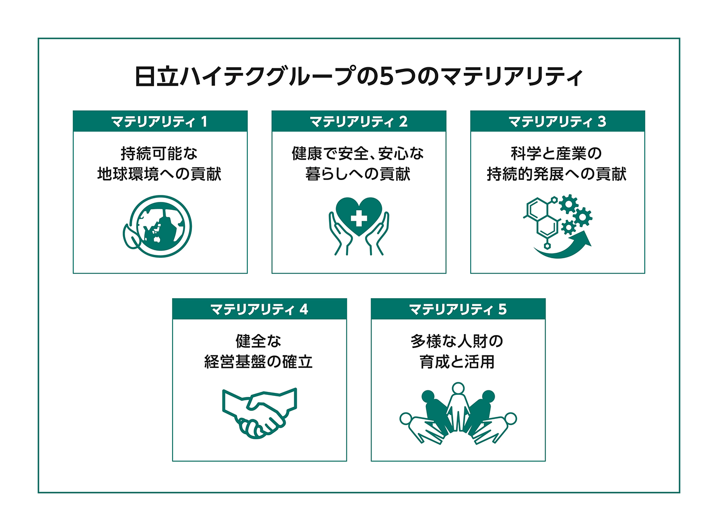 日立ハイテクグループはSDGsを踏まえて、社会課題の解決に向けて5つのマテリアリティ(重要課題)を掲げています。