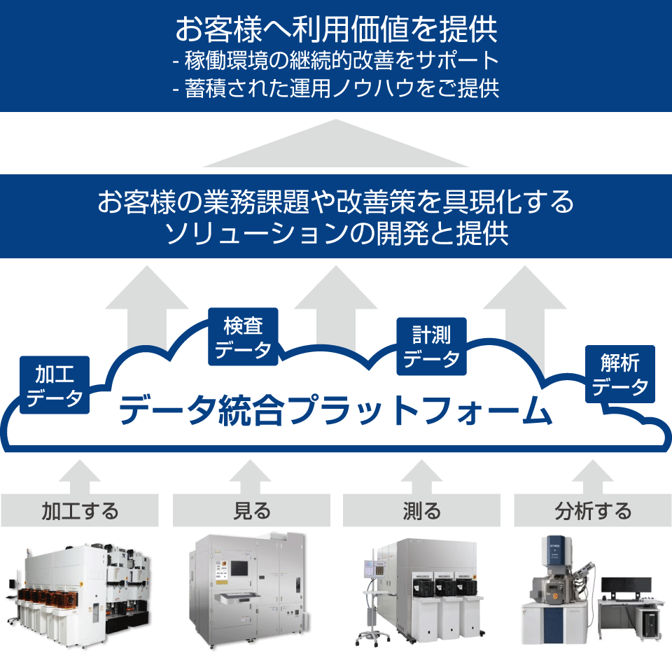 このように、日立ハイテクは独自技術によるエッチング装置に加えて「見る・測る・分析する」を含むソリューションをトータルで提供。AIも駆使し、各装置に蓄積されたデータをお客さまにフィードバックすることで、製造現場の課題解決までをサポートできるポートフォリオの開発を推進しています。