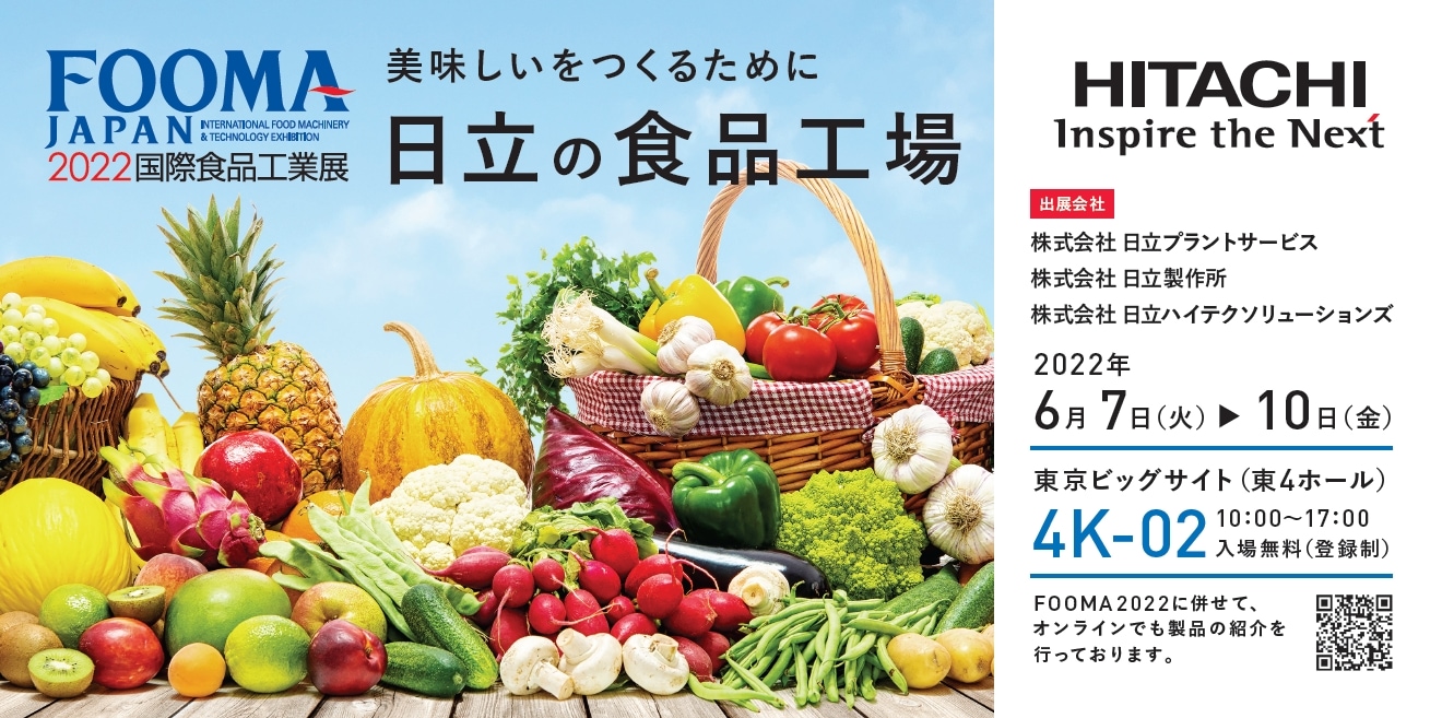| ブースコンセプト | 私たち日立グループでは、「“美味しいをつくるために”日立の食品工場」を展示会コンセプトに、工場内のあらゆる人・モノ・設備の各情報をIoT技術を活用して効率化、市場のニーズ、社会に貢献できるスマートファクトリーの実現に向け、日立のこれまでの実績を基にご提案・ご紹介いたします。