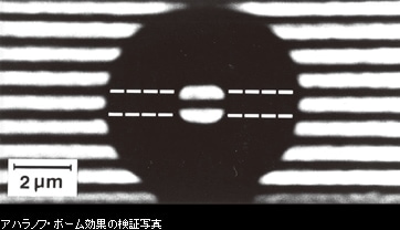 1959年にブリストル大学のヤキール・アハラノフ氏とデビッド・ボーム氏によって理論的に見出された、「電子は電場も磁場も存在しない空間でも電磁ポテンシャルの影響を受ける」という現象。磁場を完全に閉じ込めたドーナツ型超電導磁石の電子顕微鏡写真において、電子の干渉縞(写真の横縞)がずれた。これが電磁ポテンシャルの影響を示す決め手となり、アハラノフ・ボーム効果が完全実証された。
