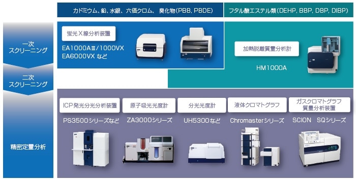 RoHS指令等の環境規制に基づく、受入・出荷検査や品質管理に広く用いられている日立ハイテクアナリシスの各種分析装置をご紹介します。スクリーニング検査から精密定量分析まで、測定ニーズに合わせてお選びいただけます。