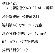 | 溶離液 | リン酸緩衝液/メタノール (a)30/70、 (b)10/90 (v/v) (a)(b)グラジエント |